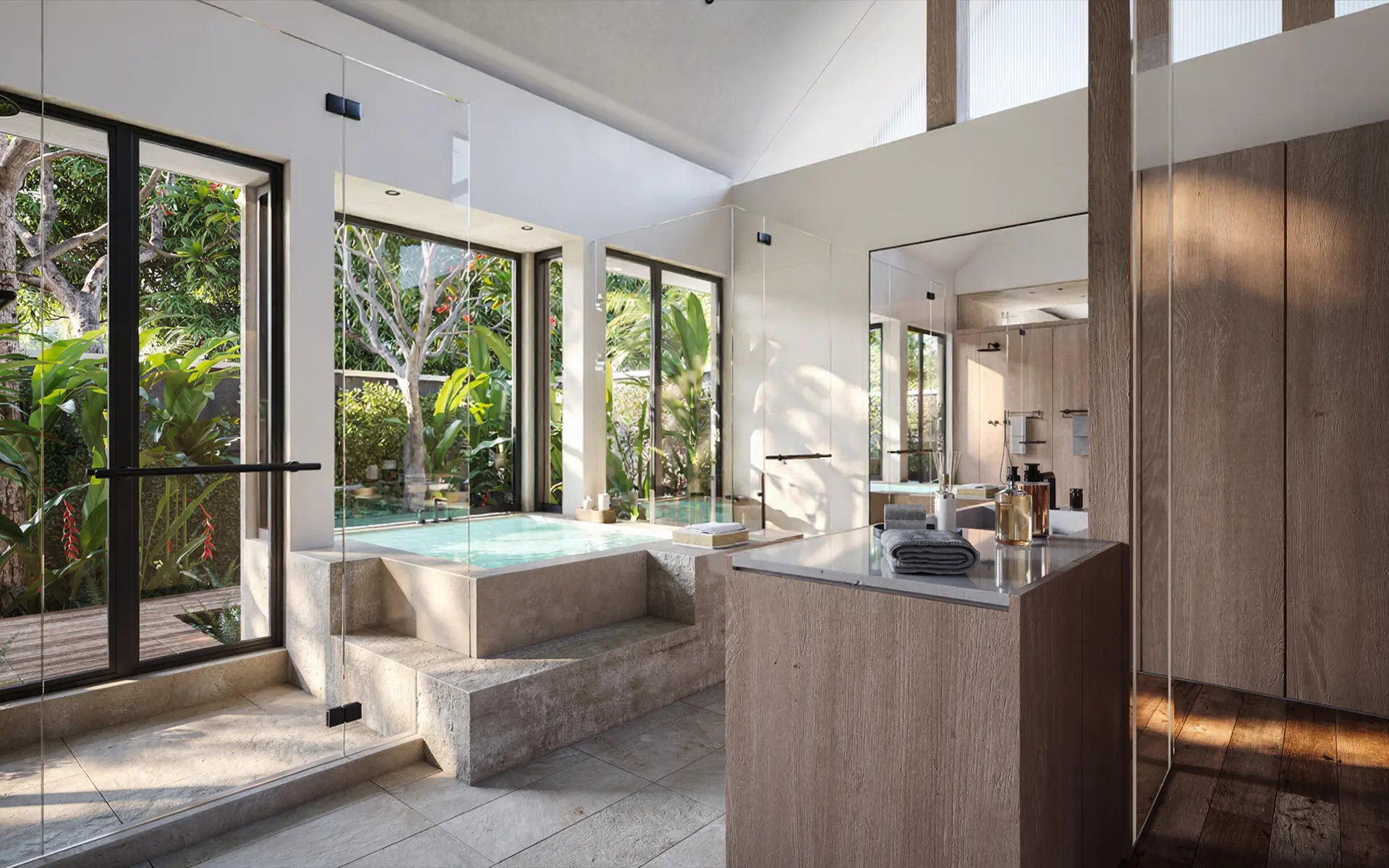 Set within a lush expanse, Riowana comprises five bespoke villas designed around water and sky. Steep cedar roofs rise above open decks and interlinked pavilions bathed in natural light, extending toward private pools and gazebos with lounge bars. Each villa balances privacy and connection — where design, light, and landscape flow as one.